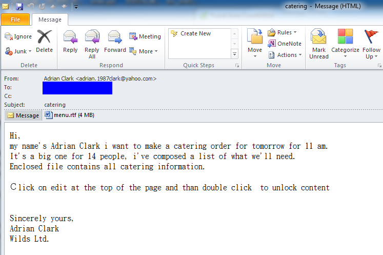 Restaurants have reported receiving catering order requests via email that look legitimate but instead contain malicious links.
